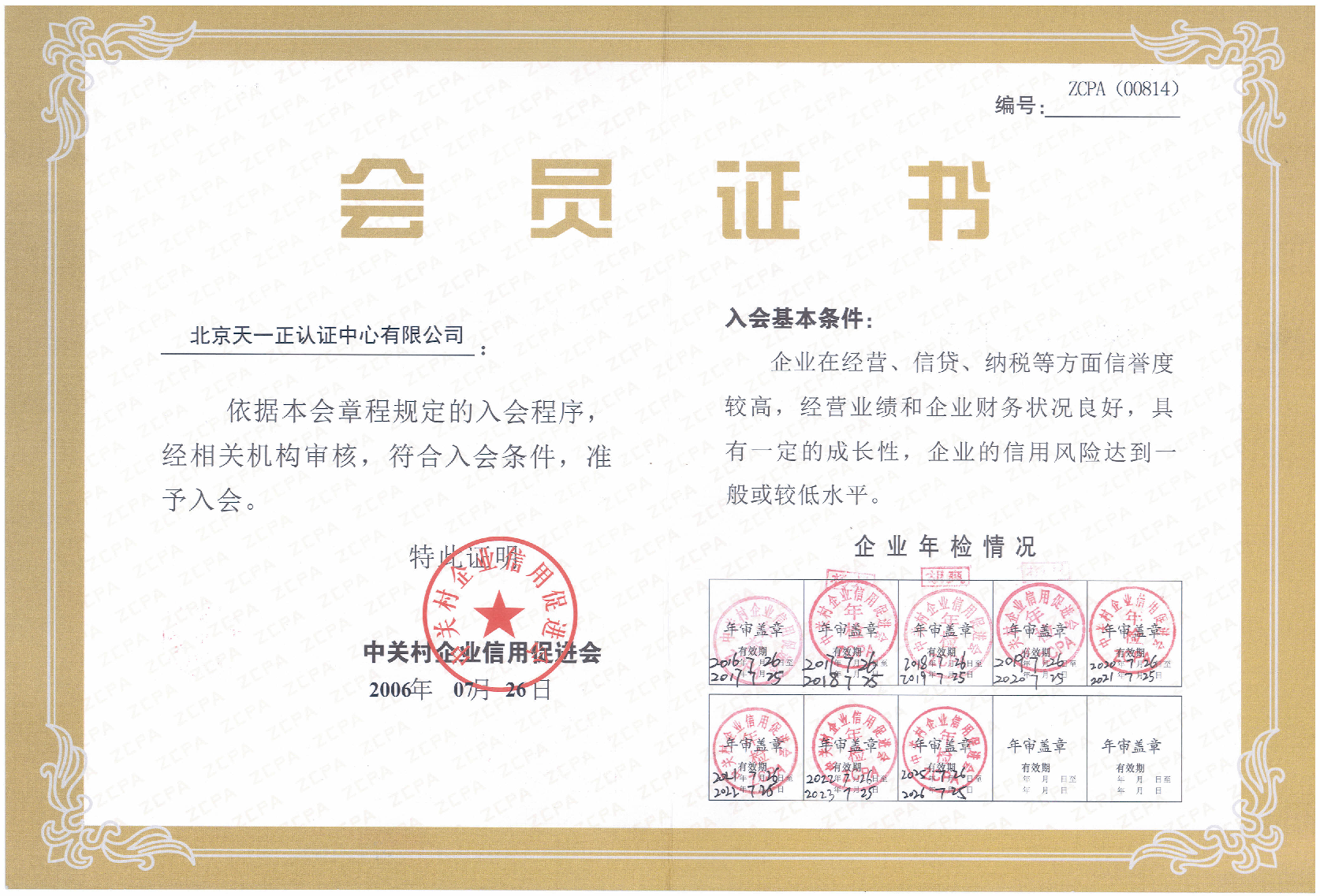 北京中關(guān)村企業(yè)信用促進(jìn)會(huì)會(huì)員證書
