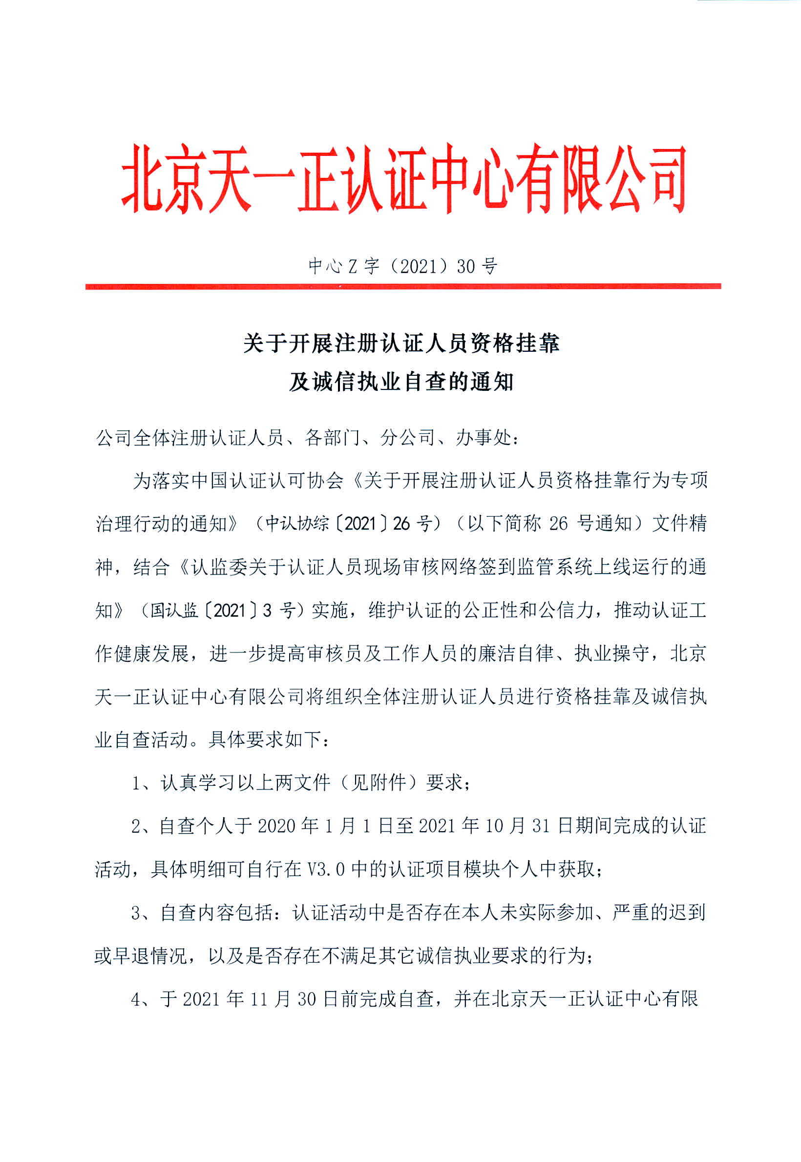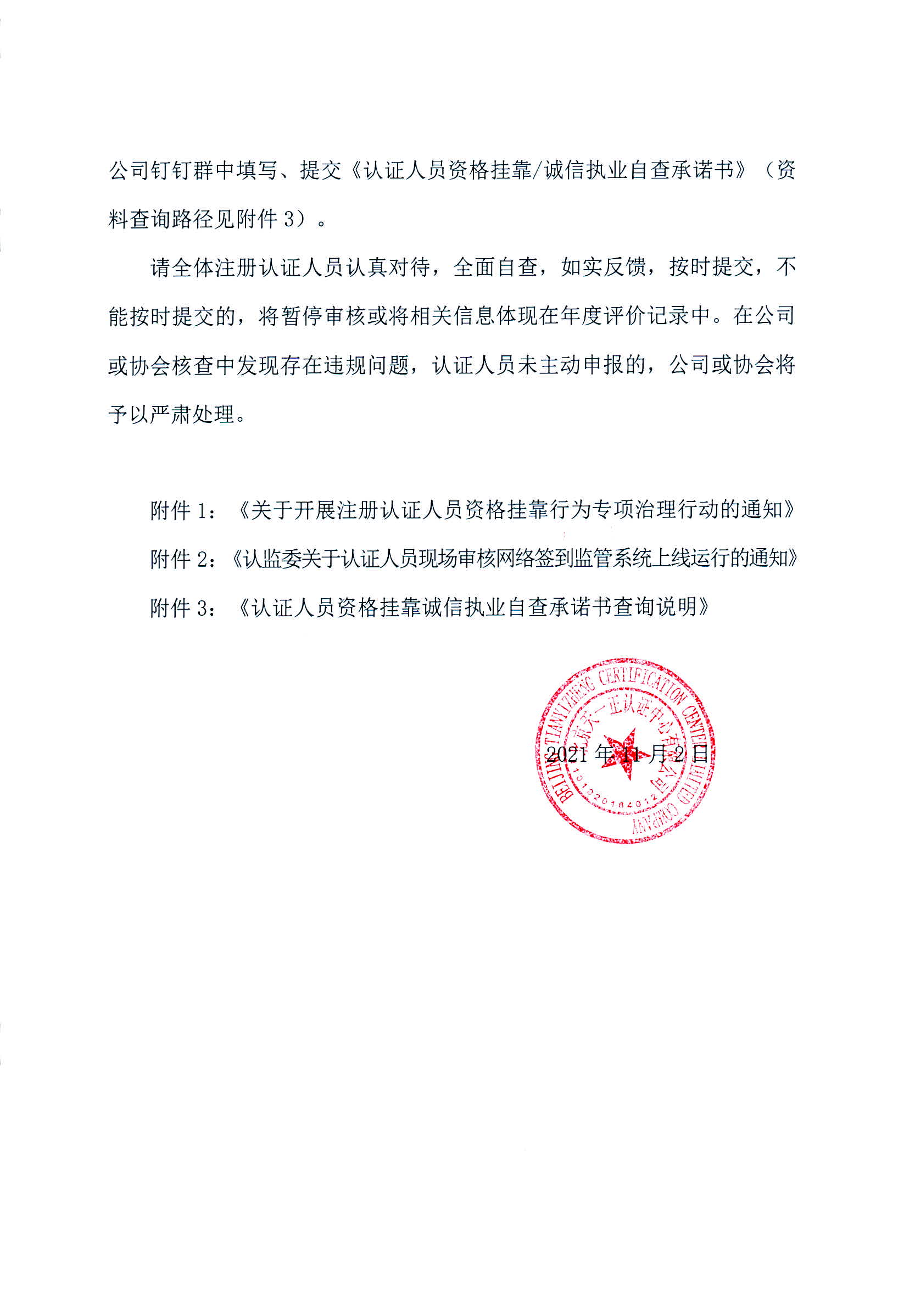 關(guān)于開展注冊認證人員資格掛靠及誠信執(zhí)業(yè)自查的通知發(fā)表時間:2021年11月03日